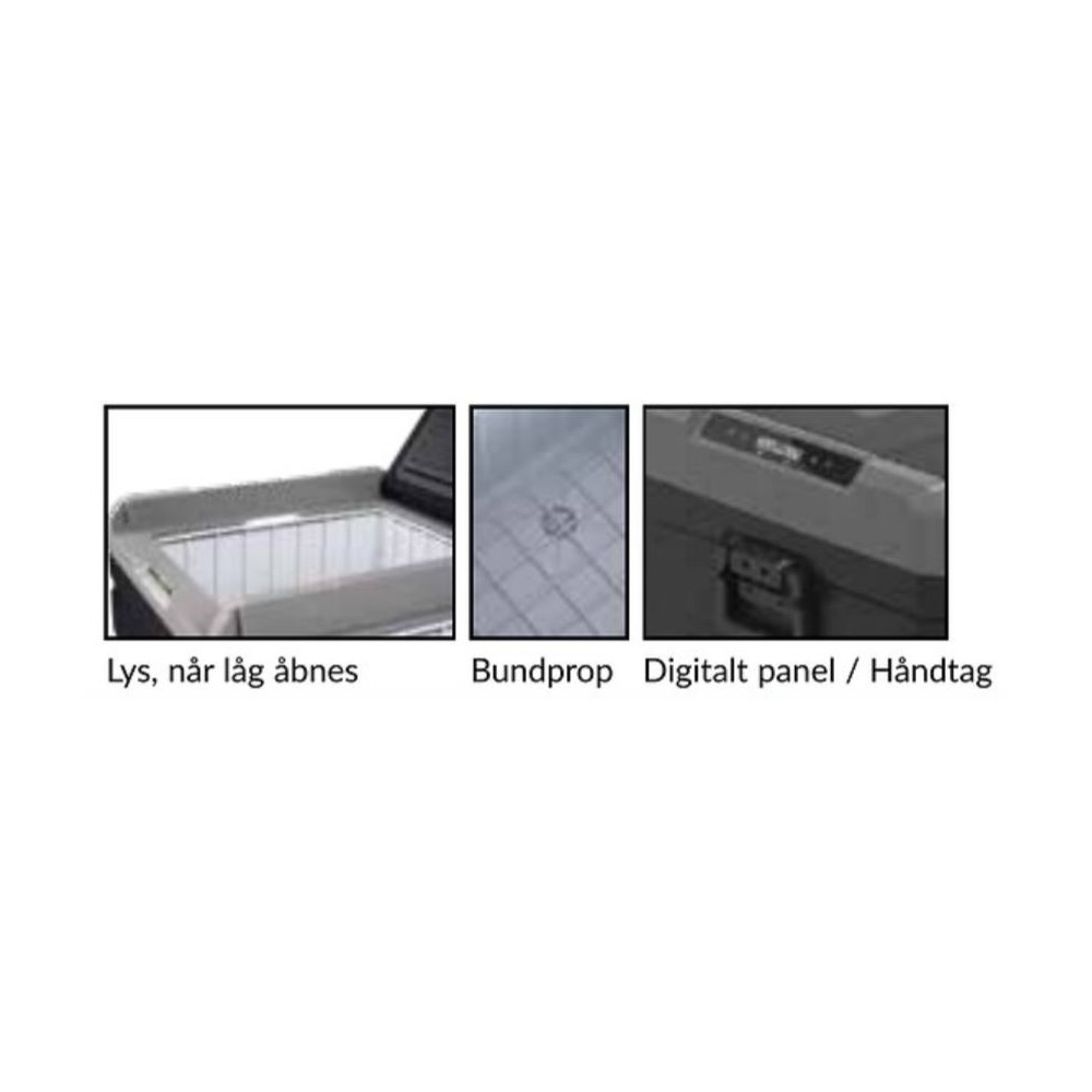 Køleboksen har smarte detaljer, som f.eks. at LED lyset tændes når låget åbnes. Det gør det nemt at se varerne i kølesboksen. Håndtagene er kraftige så den store køleboks er nem at transportere. Displayet viser temperaturen, og det digitale panel giver dig mulighed for at styre køleboksen, hvilket du også kan via en app til telefonen.
