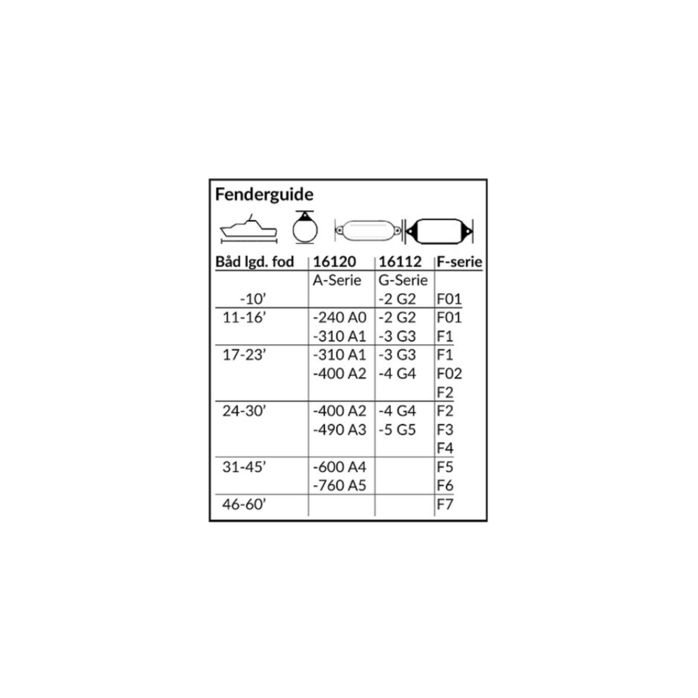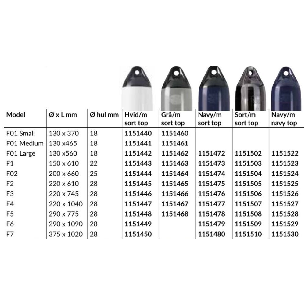 Fenderen har den et hul til reb i begge ender for nem fastgørelse. Fenderen fås i 5 forskellige farver, og 11 forskellige størrelser. Se størrelsesskema under billeder.